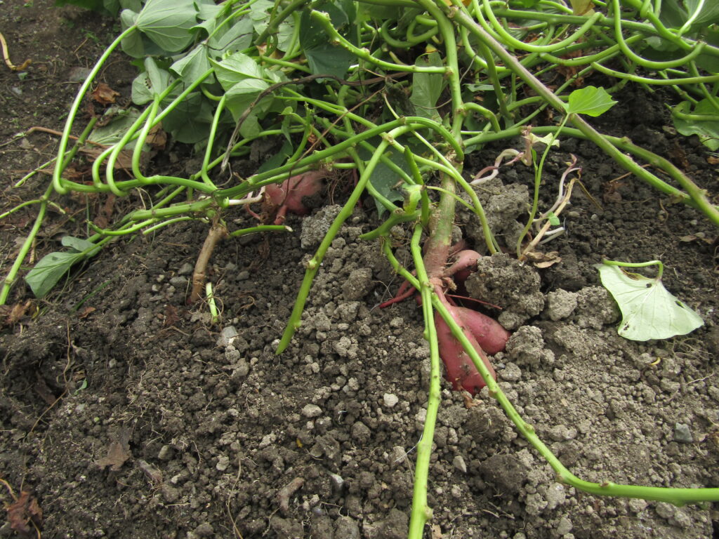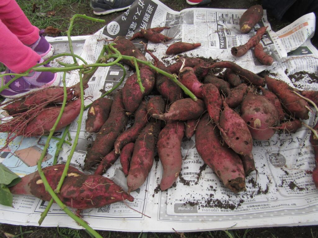土の中からお芋の頭が見えると一生懸命スコップで掘ってきました。